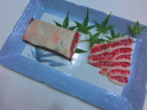 ばらの部分の、一番外側に付いている部位です。アブラも一緒に食べます。タテガミとは少し違う甘さが味わえます。肉質が少し硬いので薄めに切ってお召し上がり下さい。